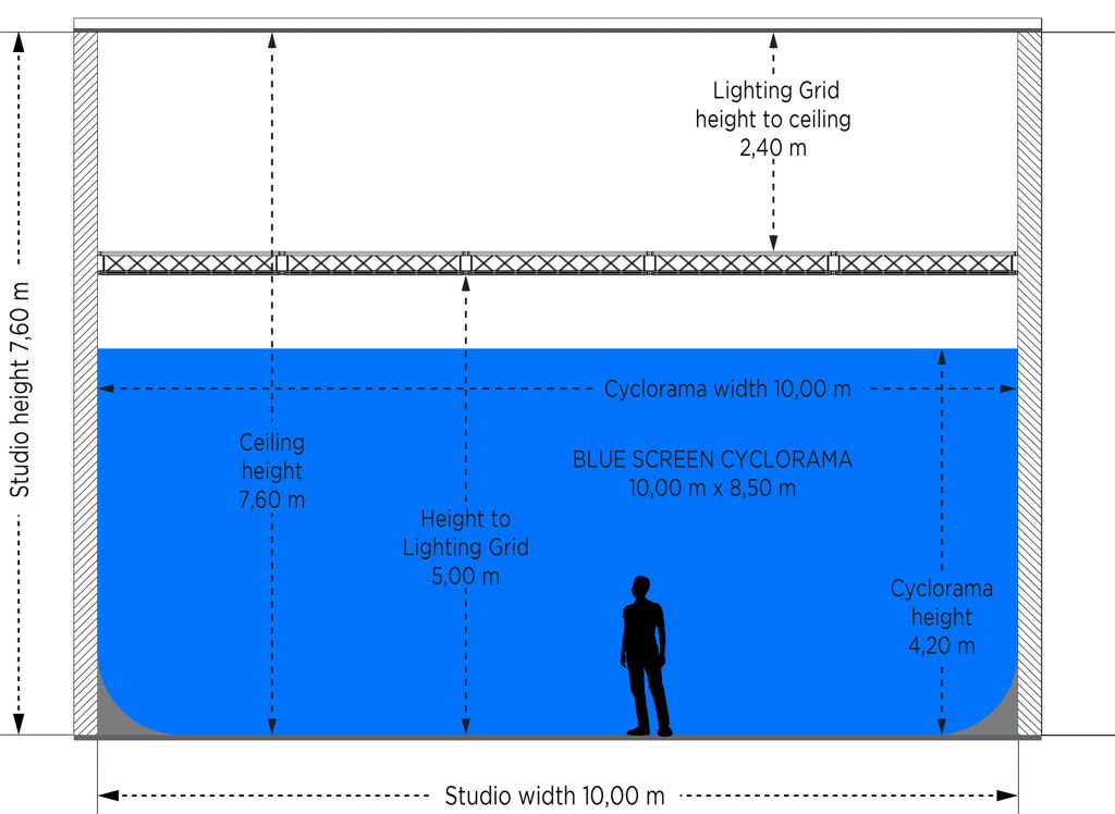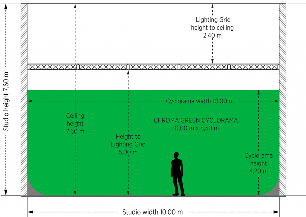 CYCLORAMA DIMENSIONS (3 WALL): W: 10.00 m x L: 8.50 m x H: 4.20 m.